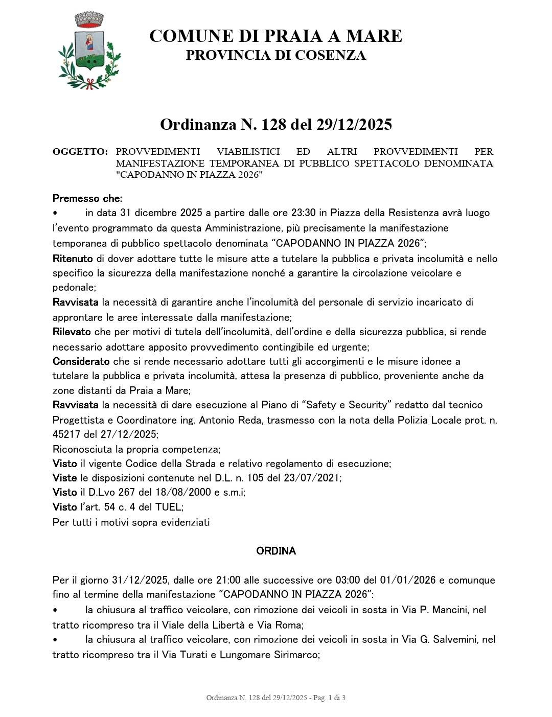 ORDINANZE CONTINGIBILI ED URGENTI N. 126, 127 E 128 DEL 29.12.2025: PROVVEDIMENTI VIABILISTICI E ALTRI PROVVEDIMENTI PER MANIFESTAZIONI TEMPORANEE DI PUBBLICO SPETTACOLO DEL 31 DICEMBRE 2025 E DEL 3 E 4 GENNAIO 2026