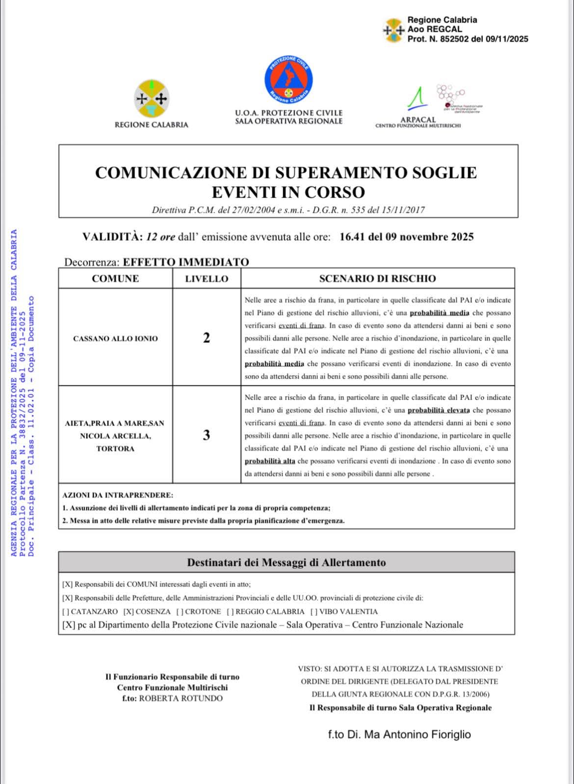 ⚠️ AVVISO ALLERTA METEO: COMUNICAZIONE DELLA PROTEZIONE CIVILE E DELLA PREFETTURA PER IL SUPERAMENTO SOGLIE! Vi invitiamo, pertanto, alla massima prudenza e a segnalare alla Polizia Locale o alle Forze dell’Ordine ogni situazione anomala o di pericolo per un pronto intervento.