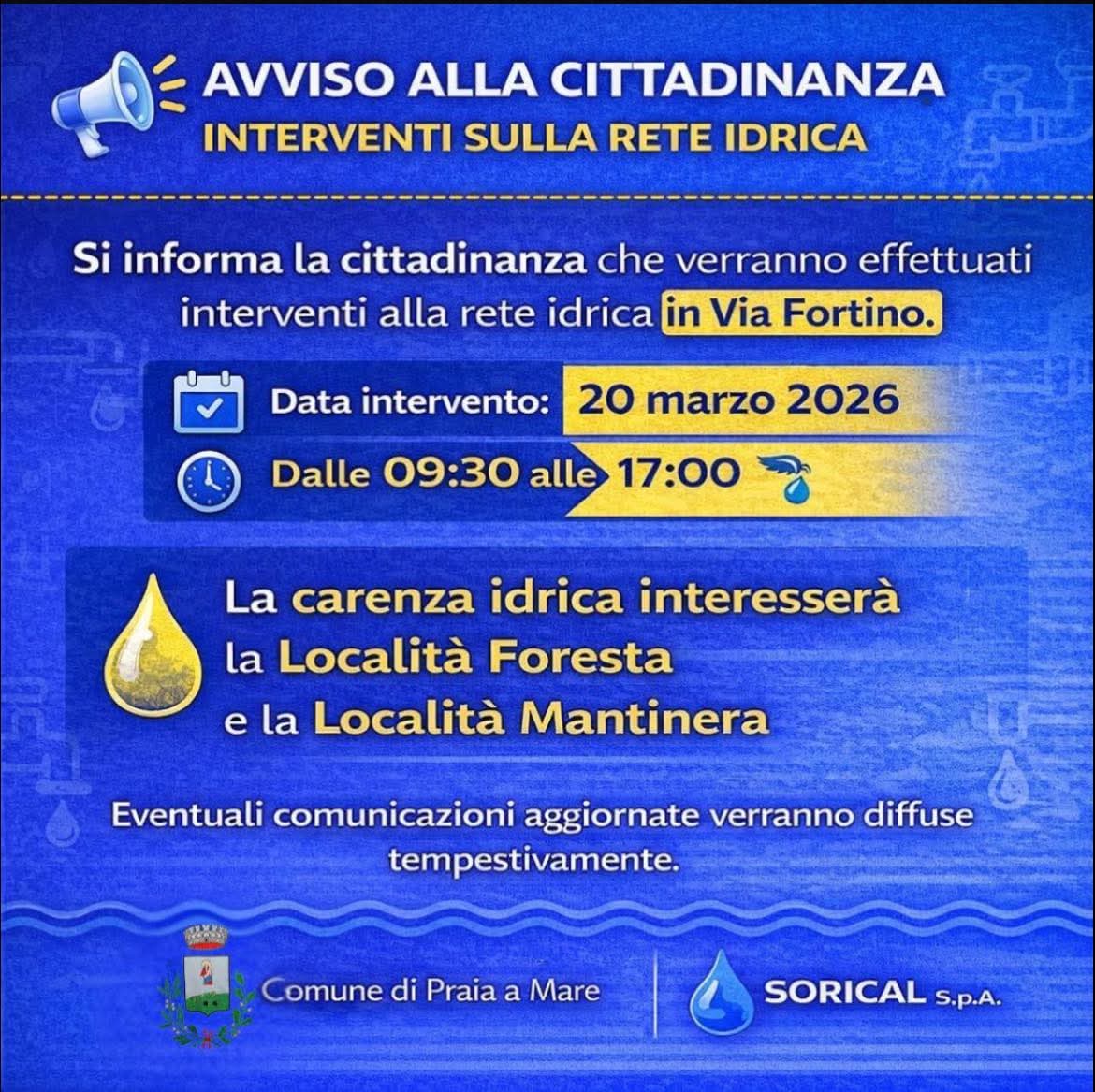 Interruzioni temporanee del servizio idrico per manutenzione programmata dei serbatoi. Pian delle Vigne e Praia centro: 3 febbraio (9:00–17:30). Zona Ospedale: 4–5 febbraio (9:00–17:30). SORICAL S.p.A. – Comune di Praia a Mare.